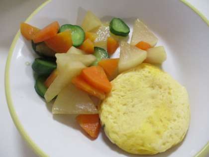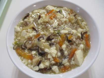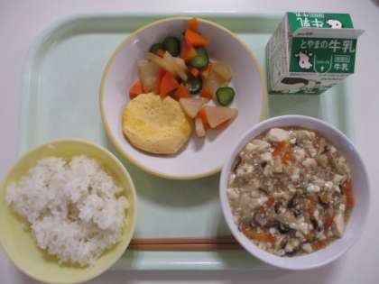 今日の給食献立は、ご飯、牛乳、かに玉、華風和え、マーボー豆腐 でした。