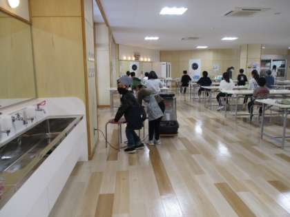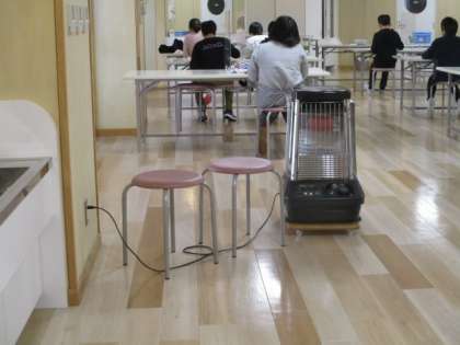 最近、特に冷え込むので、給食時間のランチルームにブルーヒーターを持ち込んでいます。その中でも入口付近が特に冷え込むので、そのブルーヒーターも入口近くに置いています。ただ、その様にしていると通行する子供たちがコードを引っかけてしまいようになるので、昨日、丸いすを2つ置いてそこを通れないようにしました。