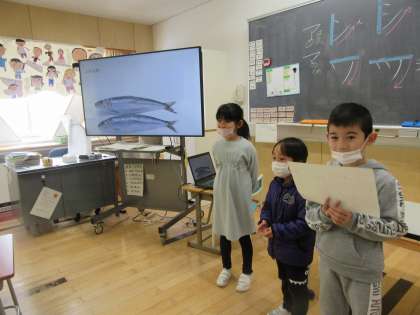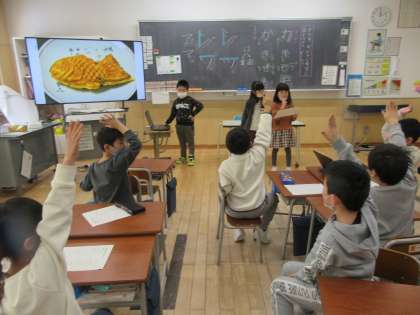 国語の学習で、「かばんの中には、カバがいる。」というようなことば遊びの学習をしました。クロームブックのスライド(パワーポイントのようなアプリケーション)を使い、三人グループで写真を見せながら、クイズ大会を行っています。答えを発表したい子供たちの「はいはい!」という元気な声が教室中に広がりました。