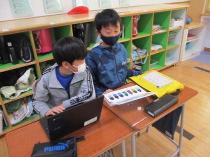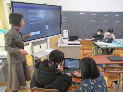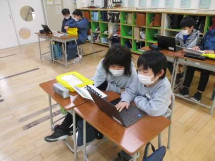 4年生も3時間目に、「MESH(メッシュ)」を使ったプログラミング学習に取り組みました。4年生はまったくの初めてなので、教頭先生の説明を聞き、進め方を確かめながらプログラムに挑戦していました。