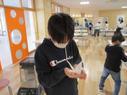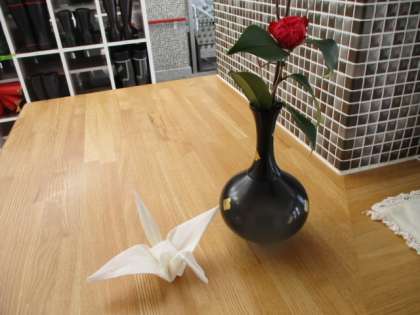 6年生が、キッチンペーパーできれいな折り鶴を作ってくれました。素敵だったので、玄関前の花と並べてみました。