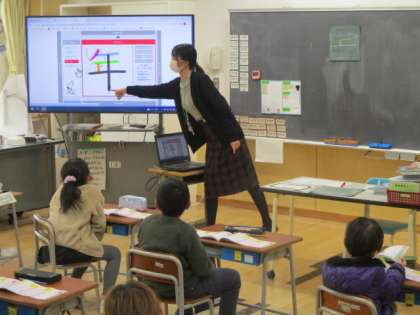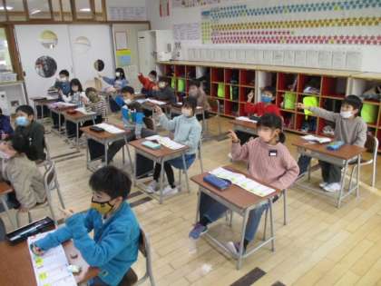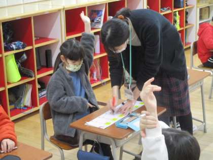 1年生の2時間目は国語の授業で、漢字練習に取り組みました。今日習った漢字は「王」「口」「年」の3つで、なぜだか子供たちは「年」の漢字を「ボス」と呼んでいました。「どうしてボスなの?」と聞いたところ、「いちばんむずかしいから」と教えてくれました。「ラスボス」からきているのかな?