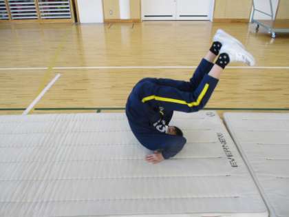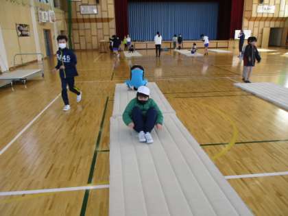 3時間目の5年生は、体育館で6年生と合同の体育でした。今日取り組んだのはマット運動です。まずは準備運動を兼ねて、前転や後転の練習です。それができると連続でやってみます。