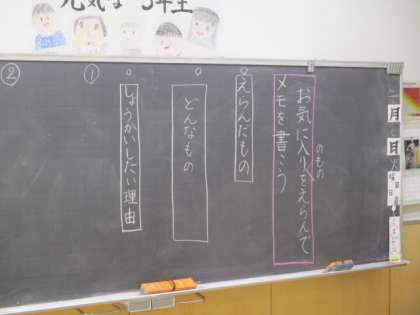 3年生の1時間目は国語の授業でした。この授業では、「お気に入りのものをえらんでメモを書こう」という学習課題で紹介文を作りました。