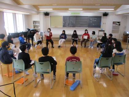 3時間目の5年生は音楽の授業でした。この授業では「大空をむかえる朝」という曲を歌い始めますが、その前に楽譜を見て「mf」があるのを確かめ、それに関連して強弱記号について習いました。