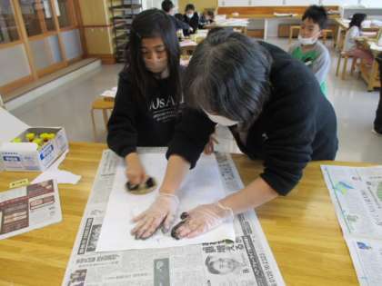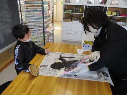 写真 上 :刷り紙の上からバレンでこすります。