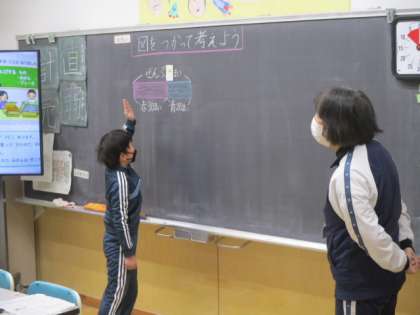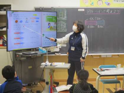 2年生の1時間目は算数の授業でした。今日は「図をつかってかんがえよう」という学習課題で、3つの数量の関係を式で表すことを考えました。