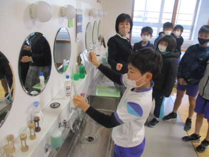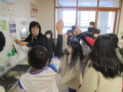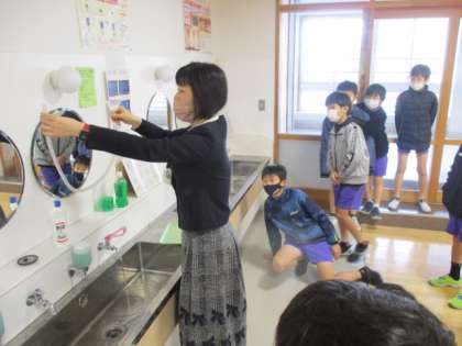 洗面所で行ったのは、サイフォンの原理を利用した実験です。予めホースに入れていた水が、片方の端を下げることでそこからあふれ出します。「だれかやってみたい人?」という教頭先生の投げかけに、「ハイ!」と元気よく手を挙げてくれました。