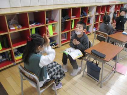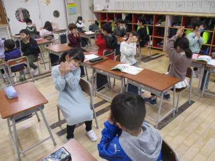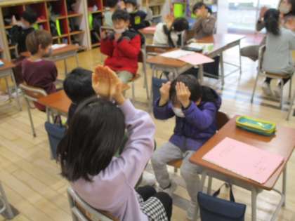 1時間目の1年生は、教室で音楽の授業でした。この授業では、みなさんもご存じの「アイアイ」を、動きを付けて歌いました。