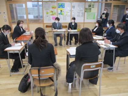 本日午後、大山地区の1中学校・4小学校の教員が上滝中学校へ一堂に会し、合同の研修会を行いました。この研修会では、まず中学校の授業を見学し、その後6つのグループに分かれて授業について話し合いました。