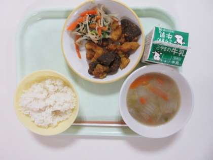 今日の献立は、ごはん、鶏肉とレバーのカレー風味、ナムル、たら汁です。野菜、魚、肉があり、栄養満点です。