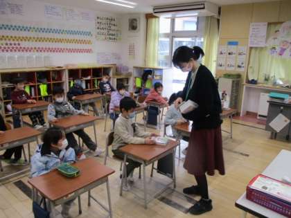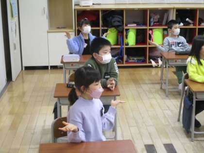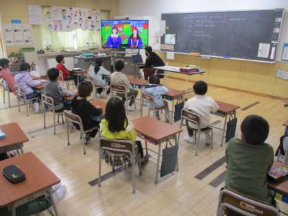 3時間目の1年生は「卒業を祝う会」で歌う歌を決めているところでした。候補として担任の先生が「ありがとうの花」を動画で紹介すると、振りを付けながらたくさん児童が歌い始めました。どうやらみんな大好きな歌のようなので、「じゃあ、こうほにしましょうね」と担任の先生が伝えました。
