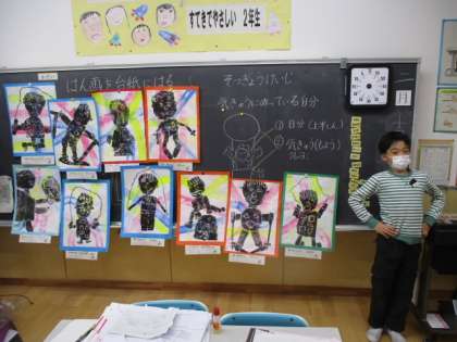 昼休みの2年生教室には、台紙を貼って仕上がった版画が飾られていました。とっても躍動感のある素敵な作品に仕上がりました。