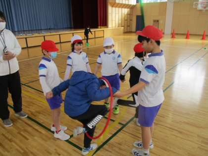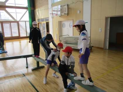 5時間目の1・2年生は、体育館を使った合同の体育でした。体育館ではいくつかのグループに分かれて、それぞれが違った運動をします。写真にあるのはグループでのフラフープくぐりと平均台を使った運動です。その他にも楽しそうな運動がたくさんありました。
