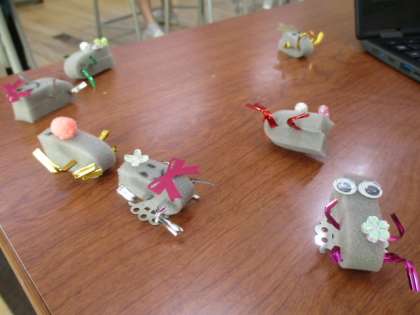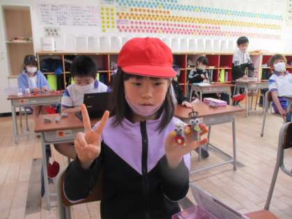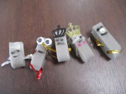 「すきまちゃん」とは、1年生が図画工作の授業で作ったスポンジの人形です。大きさは大人の親指程度です。顔をや手足を付けるだけでなく、王冠やリボンを付けてそれぞれに個性があります。