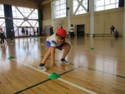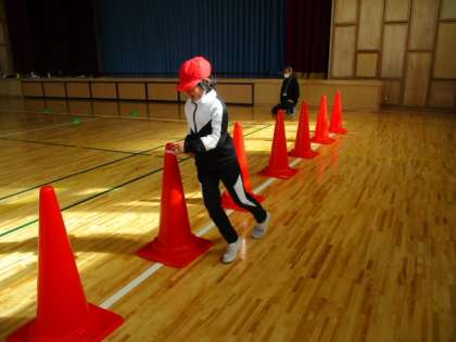 1つ目の運動はジグザグ走です。前半は、左右に置かれたマーカーにタッチして前進します。後半は、カラーコーンの間を走って戻ってきます。