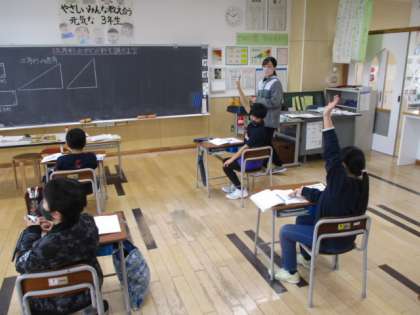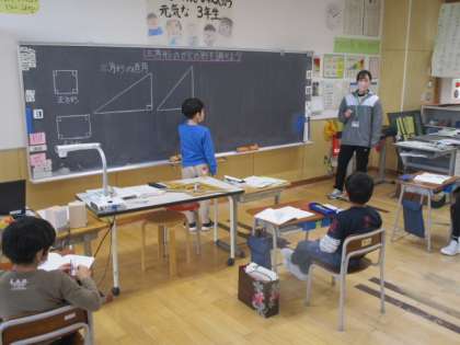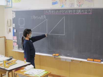 5時間目の3年生は算数の授業でした。今日の授業で習ったのは「直角」です。2種類の三角定規の中から、その「直角」を見つけ出しました。