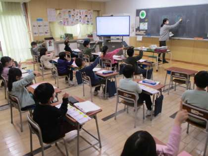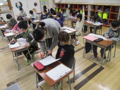 1年生の朝は、国語のモジュール学習で漢字を練習していました。今日最初に習ってのは「左」という漢字です。以前には「右」も習っています。似ていても、1画目と2画目が逆の2つの漢字。しっかりと覚えてくださいね。
