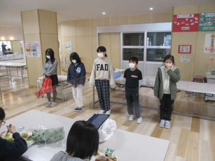 学校代表としてこの大会に参加する児童たちの活躍を祈念して、今日の給食時に紹介を行いました。(1名は写真に写っていません)