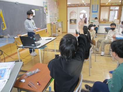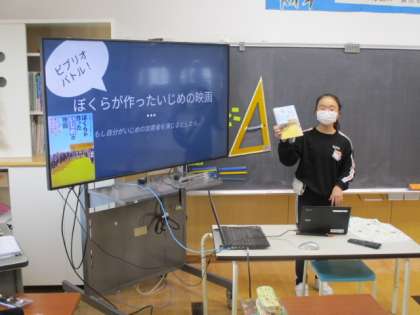 2時間目の6年生は国語の授業でした。今日は小学校最後のビブリオバトル、しかも決勝です。決勝進出者一人ずつがお薦めの本を紹介し、その後は質問コーナーです。だれが栄冠を勝ち取ったのでしょうか。