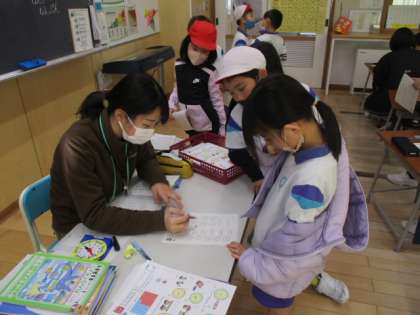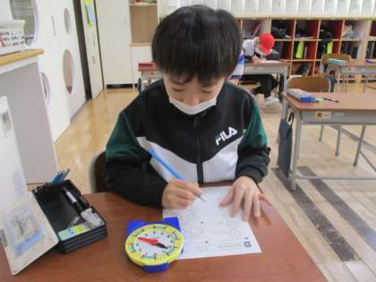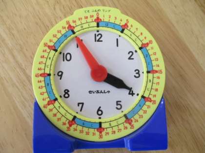 最初は要領が分からず、学習が止まっていた児童もチラホラでしたが、教具の時計を手がかりにポイントを教えると、スラスラと時刻を答えることができました。