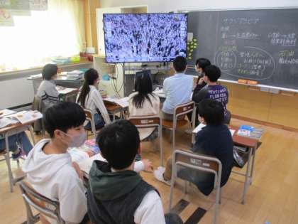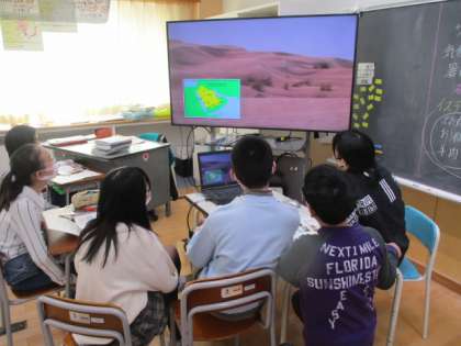 2時間目の6年生は社会科の授業でした。この授業では、これまでに調べてきたサウジアラビアについて、デジタル教科書を使ってより詳しく学びました。その中には、イスラム教の聖地巡礼の動画があり、「こんなにたくさんの人が集まるのか」とか「人じゃなくて建物が回っているように見える」といった感想がたくさん聞かれました。