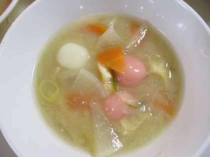 今日の給食は特別メニューでした。名付けて「卒業祝い献立」です。おめでたい席には欠かせない「赤飯」を筆頭に、紅白の「白玉」も加わっていました。また、調理員さんの粋な計らいで、6年生だけニンジンで作ったハートが入っていました。