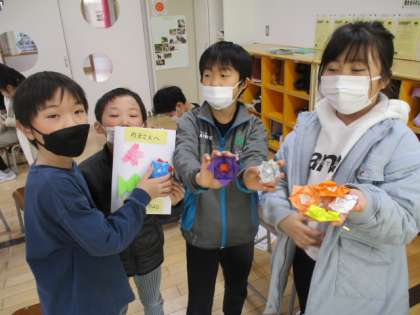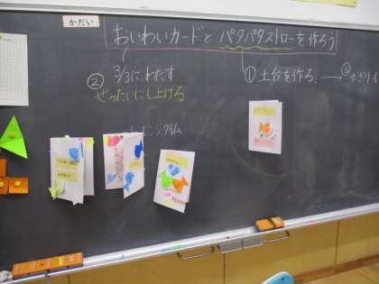 3時間目の2年生は図画工作の授業でした。この授業では、「おいわいカードと、パタパタストローを作ろう」という学習課題で工作をしました。個性豊かな作品をご紹介します。