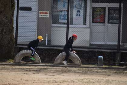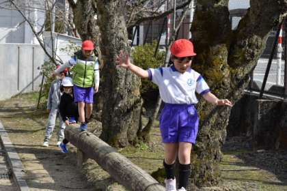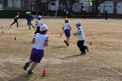 5時間目の1・2年生は、青空の下、グラウンドへ飛び出し合同で体育をしました。これまでは体育館でいろいろな運動をしてきましたが、今日は大規模に運動をします。走っていてもとってもさわやかです。