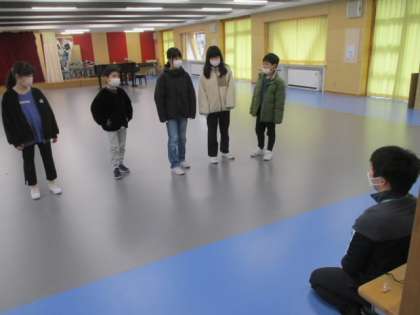 1時間目の4年生は、小グループに分かれて、それぞれに明日の「卒業お祝い集会」に向けて準備を進めました。写真はみんなの広場を使っての練習です。たくさん台詞があったようです。