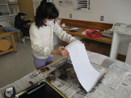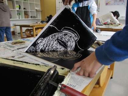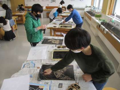 3時間目の5年生は、図工室で2グループに分かれて作業に取り組みました。1つのグループは図工の版画を刷ります。そしてもう1つのグループは、明日の集会のための作業を進めます。版画の作業は順番に進めていきました。