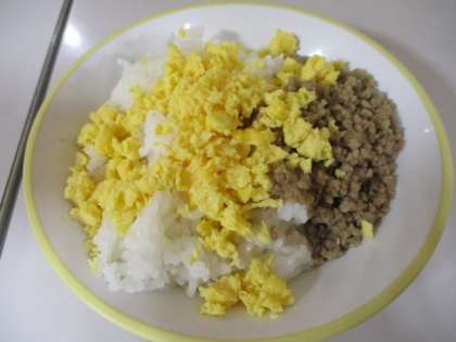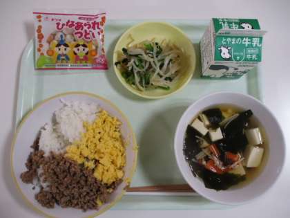 今日の給食献立は、そぼろ丼(ご飯、豚そぼろ、炒り卵)、牛乳、菜花ひたし、すまし汁、ひなあられ でした。