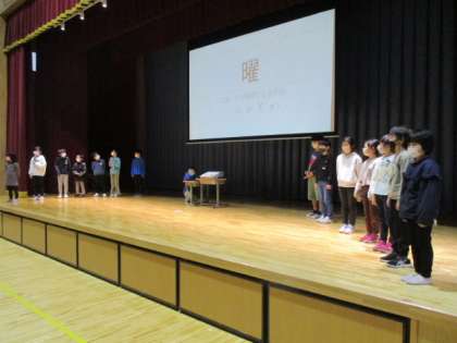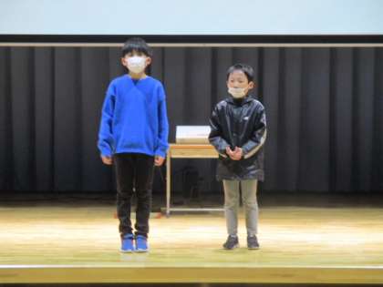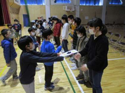 2年生は6年生を「学校クイズ」で楽しませます。そして最後には心のこもったプレゼントを手渡しました。