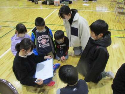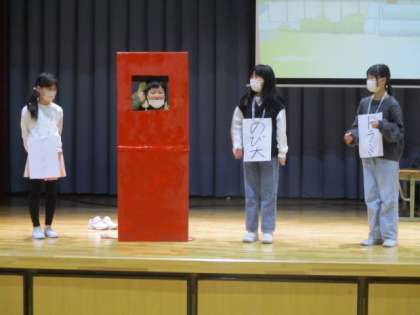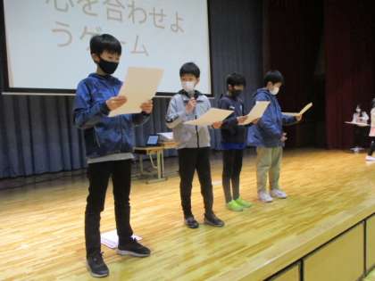 4年生はドラえもんの劇の後、「心をひとつに合わせようゲーム」で盛り上げました。このゲームは、縦割り班で集まって答えるものです。一番多い答えになったチームが勝ちです。しかし、チームワークのよい上滝小学校のことですから、1題目こそ答えが分かれましたが、その後の2題は心がひとつになり全班が同じ答えでした。