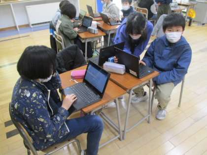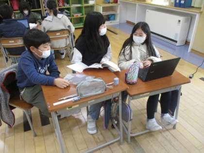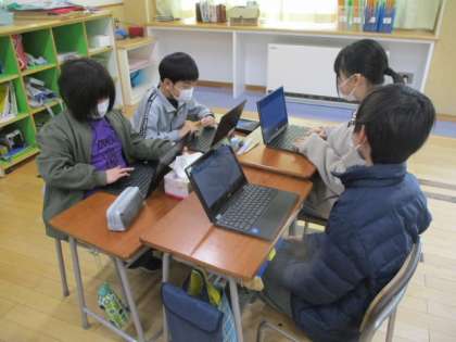 3時間目の4年生は3〜4人のグループに分かれ、クロームブックを使いそれぞれで文を作りました。文作りに関しては、「はじめ」「なか」「おわり」を意識することがポイントだそうです。
