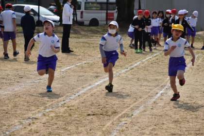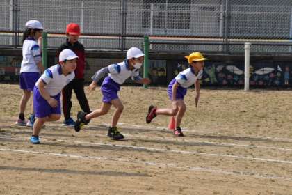 5時間目の1・2年生はグラウンドで50m走をしました。