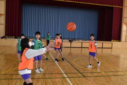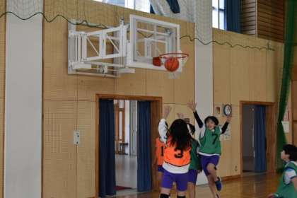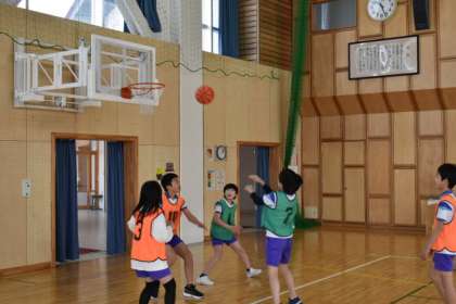 2時間目の5・6年生は合同の体育で、3×3のバスケットボールをしました。授業の前半はチーム毎の練習、そして後半はゲームをしました。