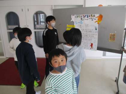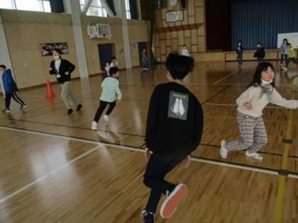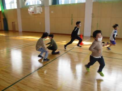 その1つ目は、名付けて「にげろ、つかまえろ、鬼ごっこーなー」です。まずは、「こおり鬼」に似た「バナナ鬼」からスタートです。集まった人数を見たとき、6年生が「こんなに多い」と嘆いていましたが、なるほど、足の速い6年生が3人いても、人数が人数だけに捕まった人もすぐに解放されてしまいます。6年生さん、ご苦労様。