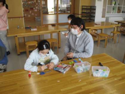 ひまわり級も、担任の先生といっしょに「卒業プロジェクト」に参加しました。写真は、牛乳パックとペットボトルのふたを材料にした「こま」を作っているところです。デザインには特にこだわりました。