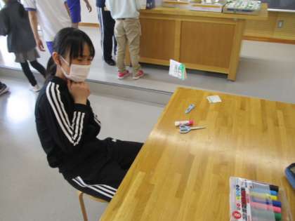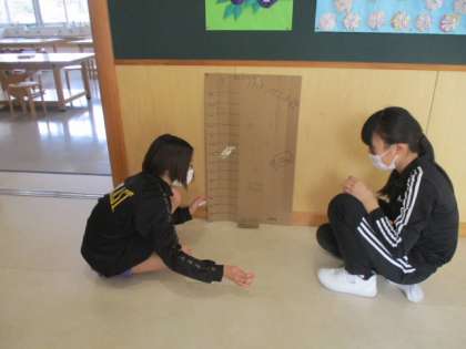「卒業プロジェクト」の内、工作に参加した5年生です。作ったのは「パッチンカエル」という牛乳パックと輪ゴムで作るおもちゃです。輪ガムの力に逆らって広げた牛乳パックを、机や床に置いておくと「あれ、まだかな?」と思った頃に飛び上がるあのおもちゃです。6年生の計らいで、廊下に目安になる高さが表示されていました。一番飛んだ時の写真は撮れませんでしたが、すごいときには45cmは飛んでいました。