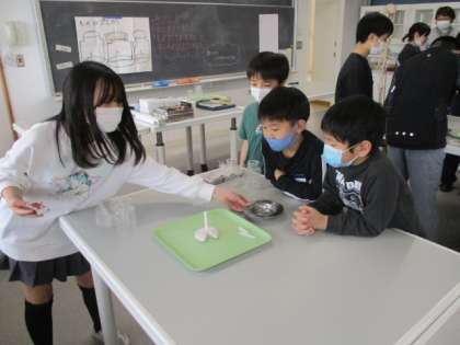3つ目のコーナーは「経験実験教室」です。このコーナーでは、火を使う実験をしていました。予想外に、まだ理科の授業を受けていない低学年の子供たちが来たので少し心配しましたが、さすがの6年生のリードで無事実験が行われました。