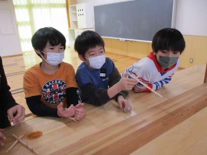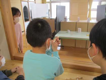 最後、4つ目のコーナーは「射的ゲーム」です。6年生の力作・割りばし鉄砲で的をねらいます。もしかしたら一番人気だったのかもしれません。