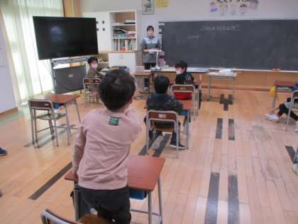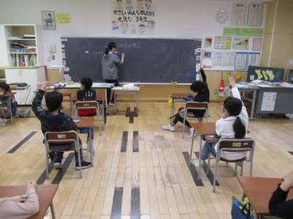 3年生教室でも、心のウオーミングアップをしていました。3年生の話題は「ご飯のおとも」です。ふりかけやシャケなどがすぐに挙がってきましたが、T2の先生は「黒作り」としぶい回答をされました。