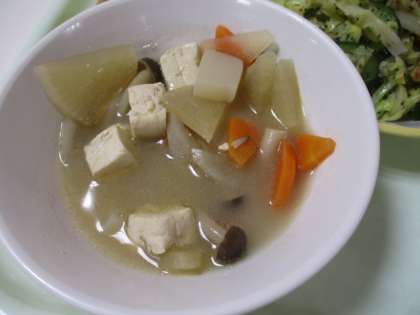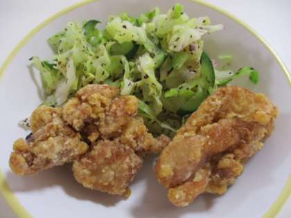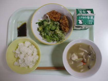 今日の給食献立は、ご飯、牛乳、鶏肉の竜田揚げ、ゆかり和え、けんちん汁、のり佃煮 でした。