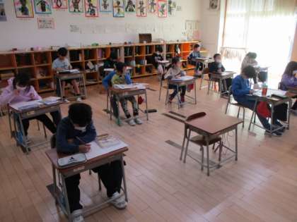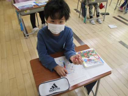 2年生教室では、今年度を振り返り「わたしのけんこう」の「わたしのくらしづくり」の部分を使って、健康なくらしができているか自己採点をしているところでした。