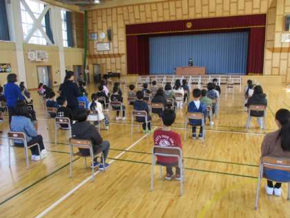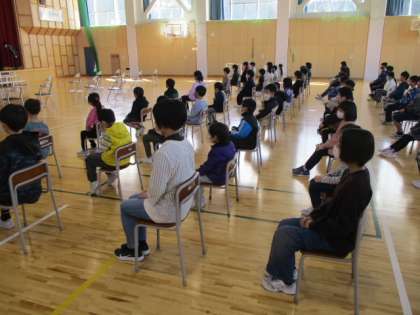 2時間目の体育館では、1年から5年生までの在校生が集まって卒業式の練習をしました。卒業式では、座っているときの姿勢や礼のタイミングを合わせることが大切です。素晴らしい式になるようしっかりと練習しました。
