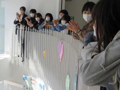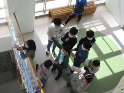 チャレンジタイムに、吹き抜けでコンサートを行いました。オープニングは、2年生の皆さんの合奏「アイアイ」です。それからは、みんなに人気がある曲をたくさん聴きました。保護者の方のギター、調理員さんのチューバ、先生のピアノの演奏に合わせて、集まった子供たちが歌っていました。吹き抜けなので音が響き、きれいな光が差し込んで、とても美しいひとときでした。
