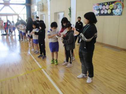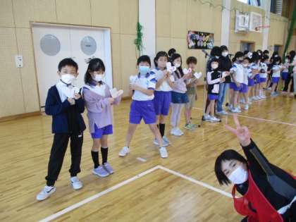 その後、先生チームはヒントをもらって何とか見つけ出しました。そして申し訳なさそうに体育館に入ってきました。これで全部そろいました。