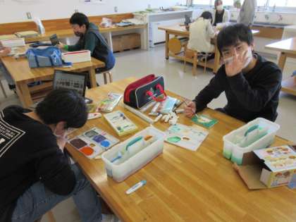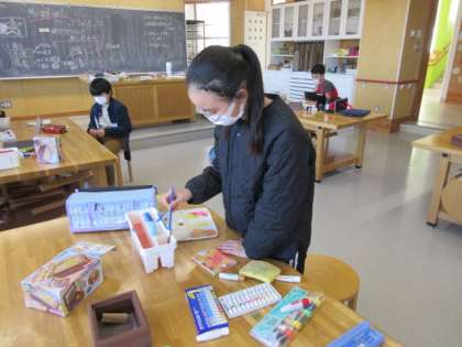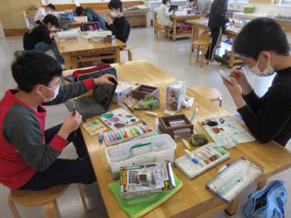 卒業式を控えて、6年生は卒業記念作品を作っていました。一人一人が思いを込めて、絵のデザインを考え、彫刻刀で彫っていました。今日は丁寧に色を塗っていました。
