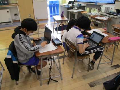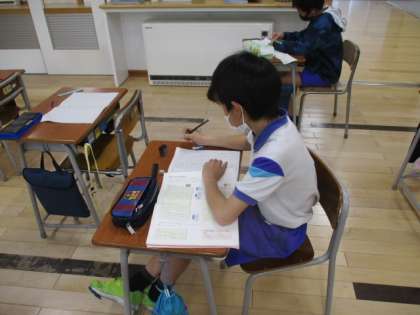 1時間目の4年生教室では、「自然災害のそなえについて考えた文を書こう」という学習課題で、作文に取り組んでいました。「はじめ」「中」「終わり」を意識して書くことがポイントとして挙げられていました。